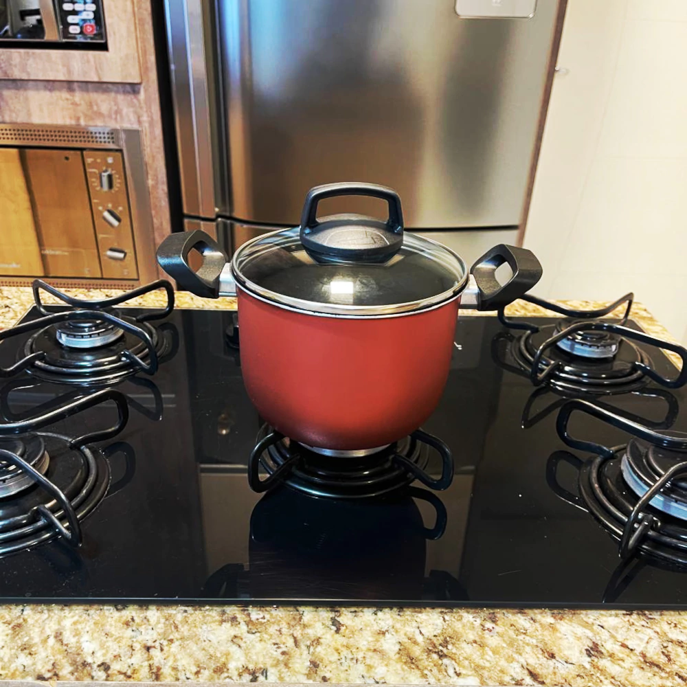 Tampa de vidro temperado: permite visualizar o preparo dos alimentos sem precisar levantar a tampa, evitando perda de calor e sabor. Cabos e alças em baquelite antitérmico: proporcionam segurança e conforto durante o manuseio, mesmo com o caldeirão quente. Alumínio de alta qualidade: garante distribuição uniforme do calor, cozinhando os alimentos mais rapidamente.