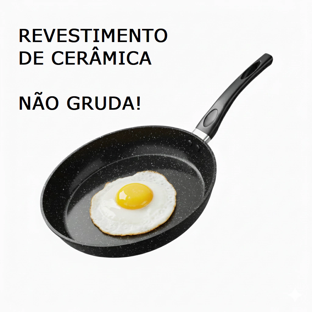 Antiaderente de Cerâmica Superior: Cozinhe com quase nenhuma ou nenhuma gordura! O revestimento de cerâmica de alta performance garante que ovos, panquecas, peixes e vegetais deslizem facilmente. Saúde e sabor na mesma panela.
