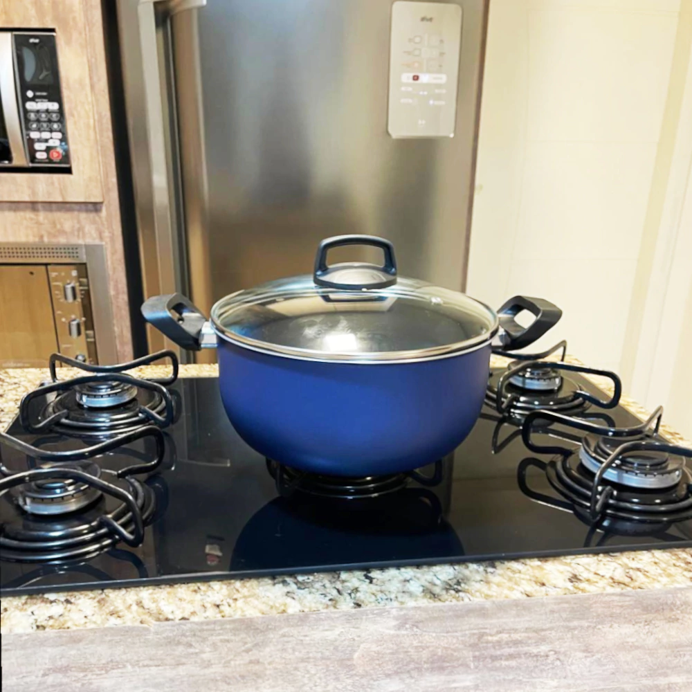 Panela de aluminio grosso na cor Azul, com revestimento Superflon de 3 camadas, com tampa de vidro temperado.
