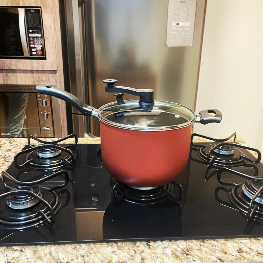 A tampa de vidro temperado permite que você acompanhe o preparo sem precisar abrir, e a saída de vapor evita que a tampa embace.